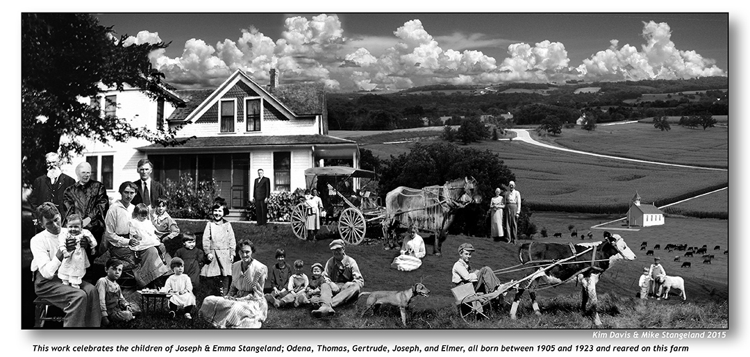 | This work celebrates the lives of Emma Kloster Stangeland & Joseph Stangeland, our Norwegian grandparents and their parents Aanen & Gertrude Stangeland, and Anders & Inger Kloster. The farm in the upper venue was built by Aanen & Gertrude and the farm in the lower venue was Joseph & Emma’s. My grandmother Emma took family photographs with her Brownie camera from 1904 until she died in 1946. It was an amazing camera, the images she left us are an invaluable heritage and have allowed her descendants to reconstruct and appreciate the lives that they lived. We'll be using them for years to come. (Click on the art work to get the full sized image.) |