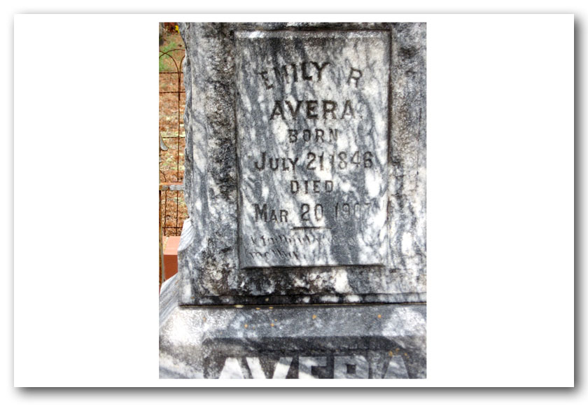 Green Hood Avera's wife Emily R. Avera's grave in Little Union Primitive Baptist Church Cemetery, Crawford Co., Georgia |